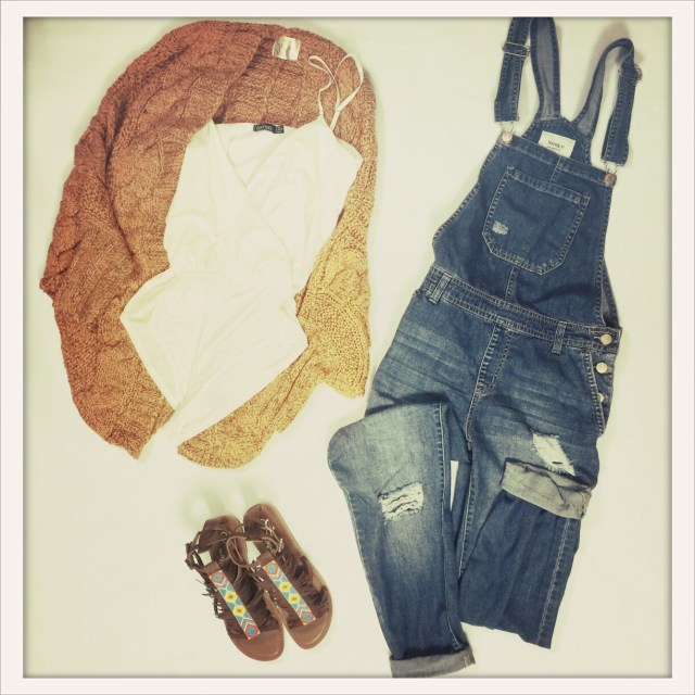 Photo Information: Bodysuit – Boohoo, Overalls – Forever 21, Cardigan (via Asos), Sandals – Coconuts by Matisse (via Nordstrom Rack).