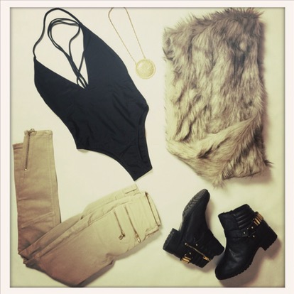 Photo Information: Swimsuit/Bodysuit – Swim Classy, Pants – H&M, Boots – H&M, Faux Fur Infinity Shawl – Forever 21, and Necklace – vintage 1970’s.
